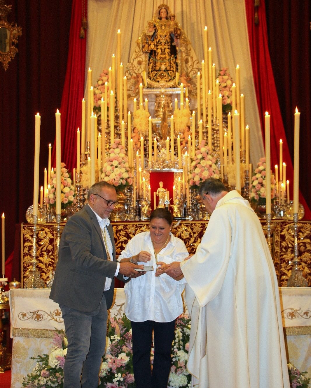 En un emotivo gesto de devoción y hermandad, el pasado miércoles, 22 de octubre, al finalizar el solemne Triduo en honor a la Virgen del Carmen, se hizo entrega a la Hermana Mayor de la Virgen del Carmen, Ana Belén Haro Marcelo, a manos de nuestro Hermano Mayor, Enrique Haro, de un hermoso Rosario personalizado como ofrenda especial en reconocimiento a la inminente Coronación Canónica de la sagrada imagen.